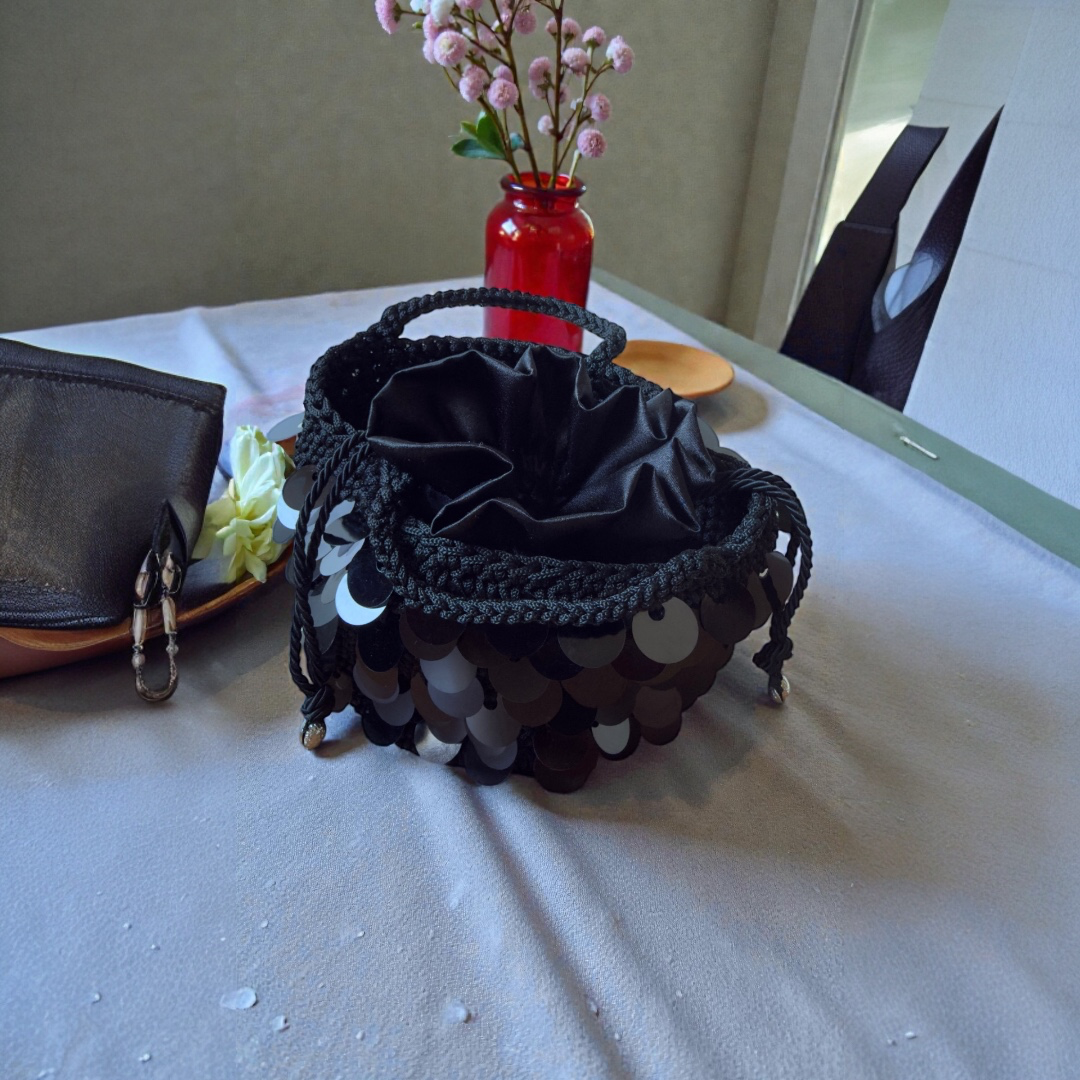 Secchiello realizzato a mano all’uncinetto e decorata con maxi paillettes.